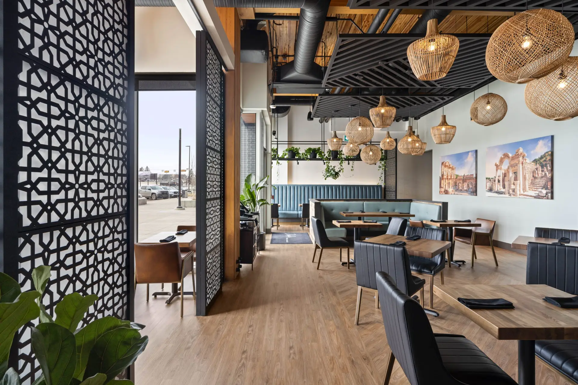 High-definition visual displays integrated into the restaurant’s interior design